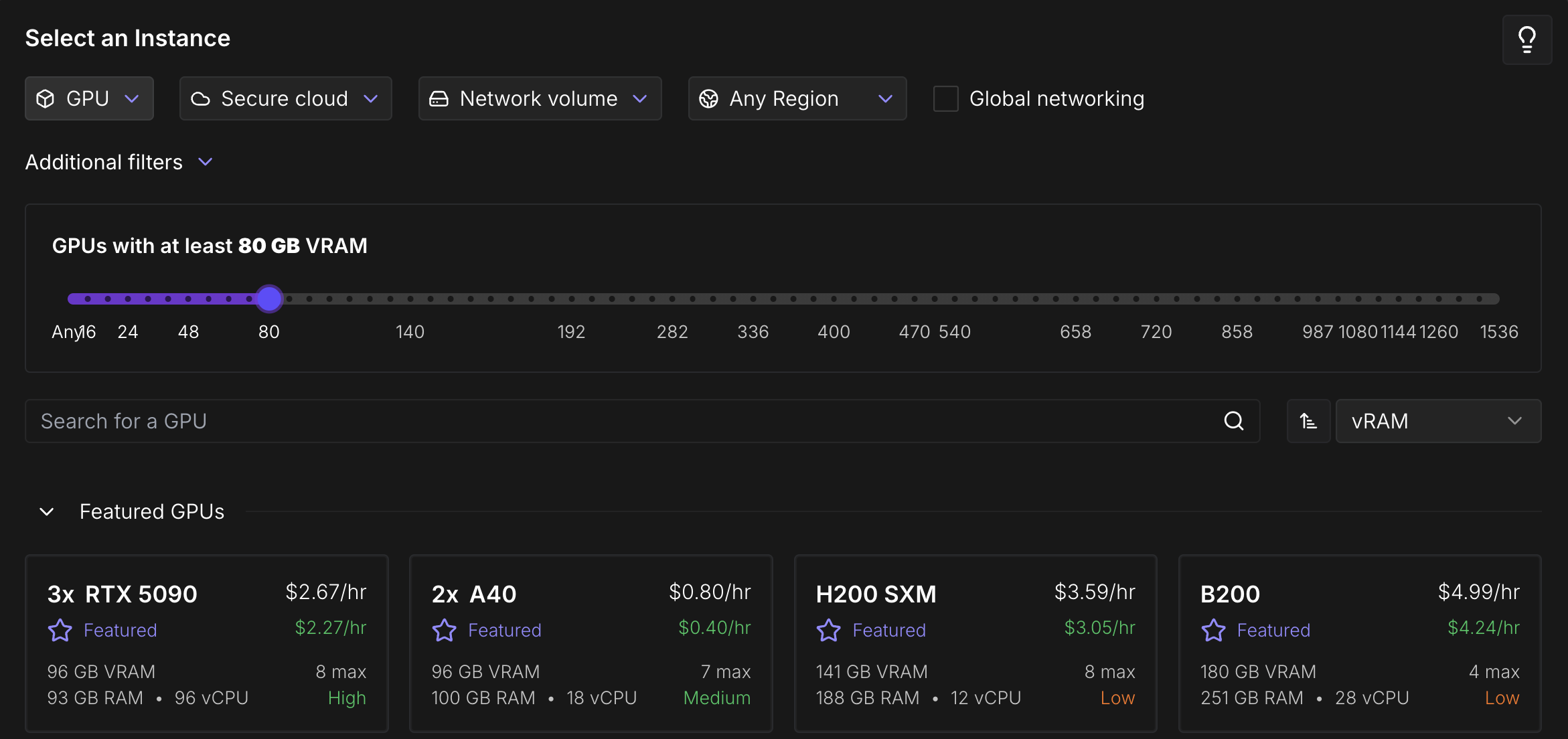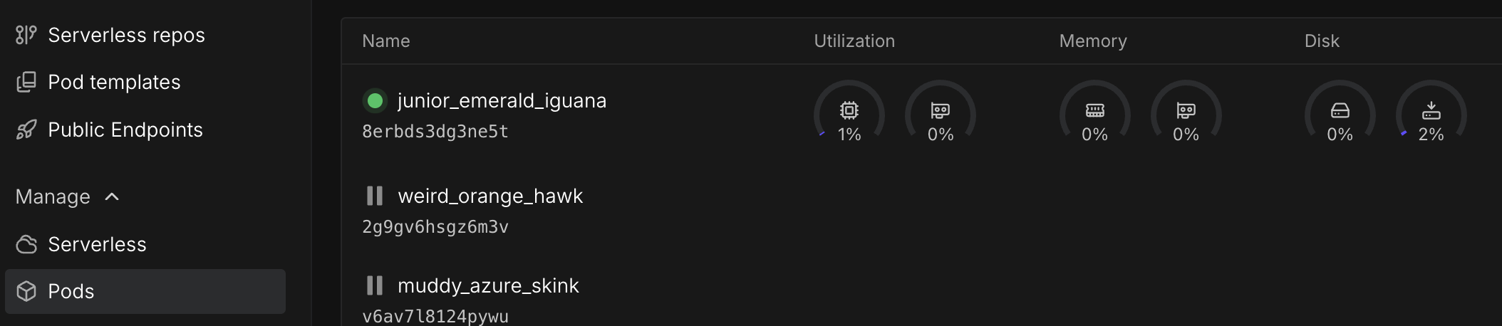 INFO: high memory utilization - 42.87GiB / 46.57GiB (92 %)In general, transformers-based models require 2GB of memory for every 1 billion parameters they have, if you are loading them at full weights (FP16). You can load quantized versions of those models that use less memory since they do not require as much precision, at the expense of model outputs being lower quality or less precise. If you need to specify a VRAM requirement for your use case, feel free to specify a minimum amount when deploying and you will only be shown GPU specs that meet that criteria.