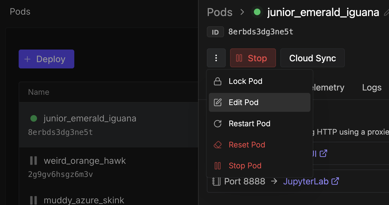 Fixing this one isn't too bad. It's just a matter of going to your pod list, pulling down the pod you're working and clicking Edit Pod. Be aware, though, that changing the parameters will force a reset of your pod, so ensure that anything you want to save is in your /workspace folder. Once the pod restarts, you should be good to go.