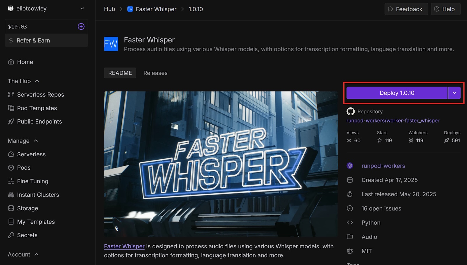 Now that we’ve seen how much faster and cheaper Faster Whisper on Runpod is compared to Whisper, let’s deploy an endpoint using Runpod Serverless and try it out.